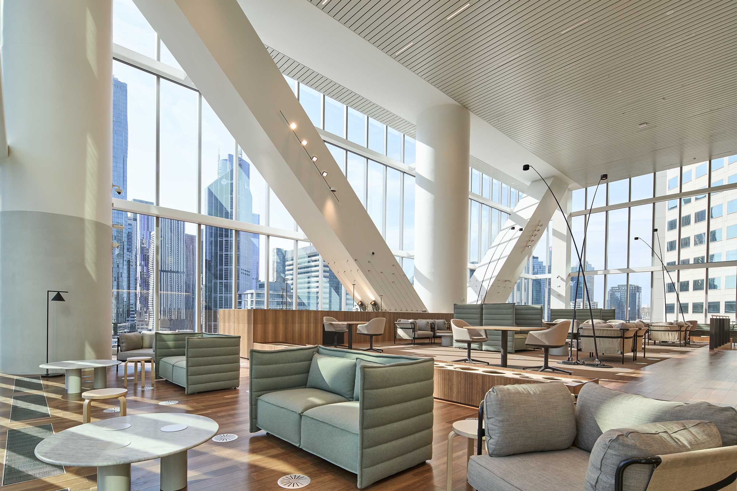 NAB Place Melbourne is housed within the luminous 405 Bourke Street building known as 'The Lantern', designed by Woods Bagot. The workspace itself was designed by Hassell Studio and occupies 39 levels of the building.