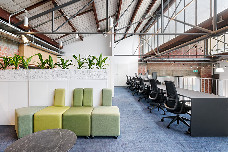 The use of plush fabric furniture and walls clad with acoustic material create a comfortable atmosphere whilst planter boxes scattered throughout add a touch of greenery to the space.